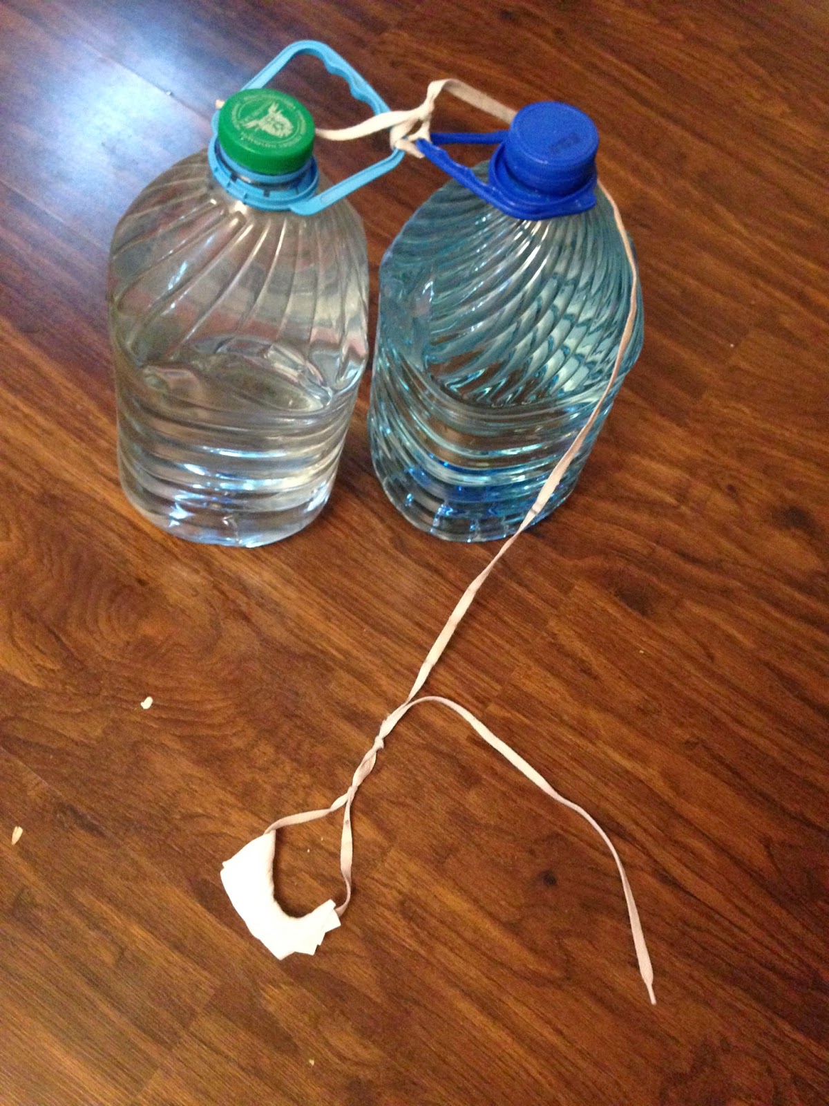 Я набрал большие емкости воды вместо гирь, вынял со своих кед шнурок и принялся пробовать!
